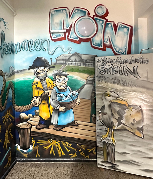 Zur Saison 2025 haben sechs Graffitikünstlerinnen und -künstler das Thema Ostsee kunstvoll in unser Haus gebracht. Unsere Gäste bekommen damit einen Einblick in unser Schullandheim am Deich.