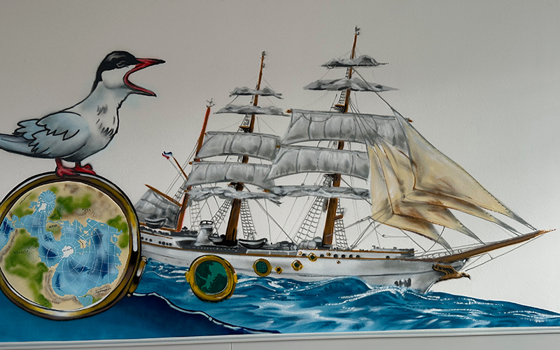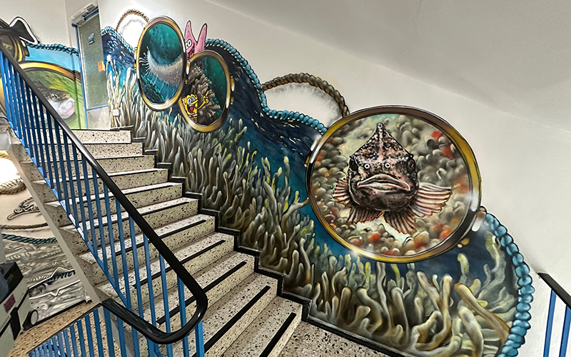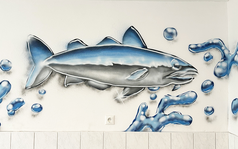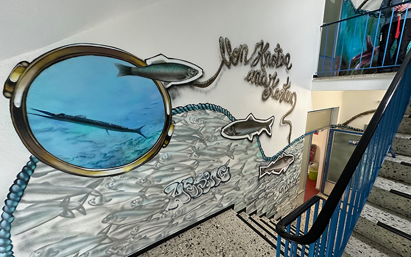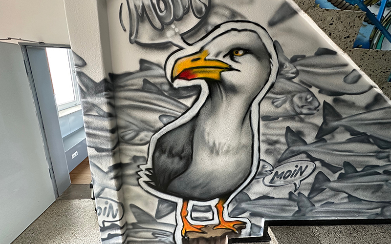 Im Schullandheim Stein an der Ostsee ist Kunst mehr als nur Dekoration – sie ist ein Fenster zur Welt, die uns umgibt. Unsere neue Graffiti-Kunst verwandelt Wände in lebendige Erzählungen über den einzigartigen Lebensraum Ostsee. Farbenfroh und ausdrucksstark greifen die Werke die faszinierende Tierwelt auf, von verborgenen Meeresbewohnern bis hin zu bekannten Küstenarten, und machen ihre Schönheit und Verletzlichkeit sichtbar.
